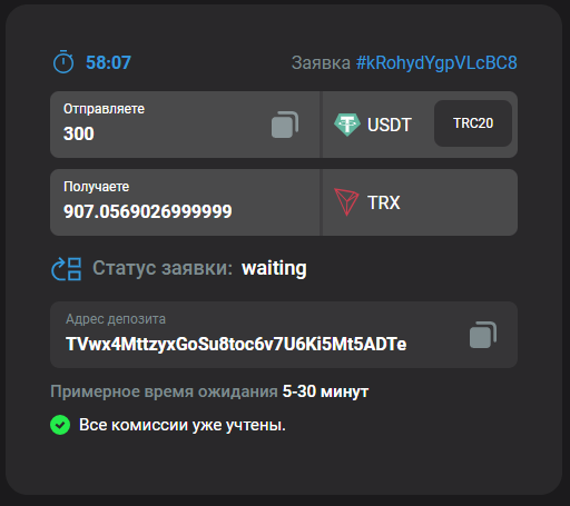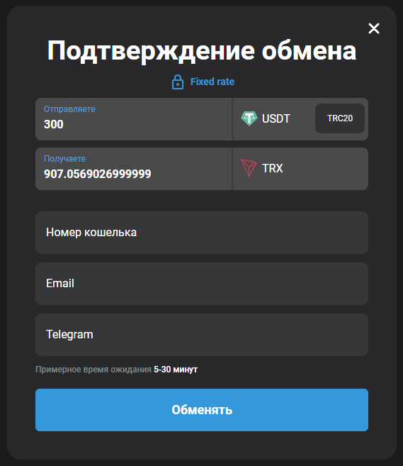 Для успешного подтверждения обмена заполните все необходимые поля. Укажите адрес вашего кошелька, на который будут отправлены средства, а также ваш актуальный email и Telegram для связи (В случае авторизации на сайте указание данных полей не потребуется). После проверки введенных данных нажмите на кнопку «Обменять». Обратите внимание, что примерное время ожидания составляет от 5 до 30 минут. Убедитесь, что вся информация введена корректно, чтобы избежать задержек в обработке транзакции.